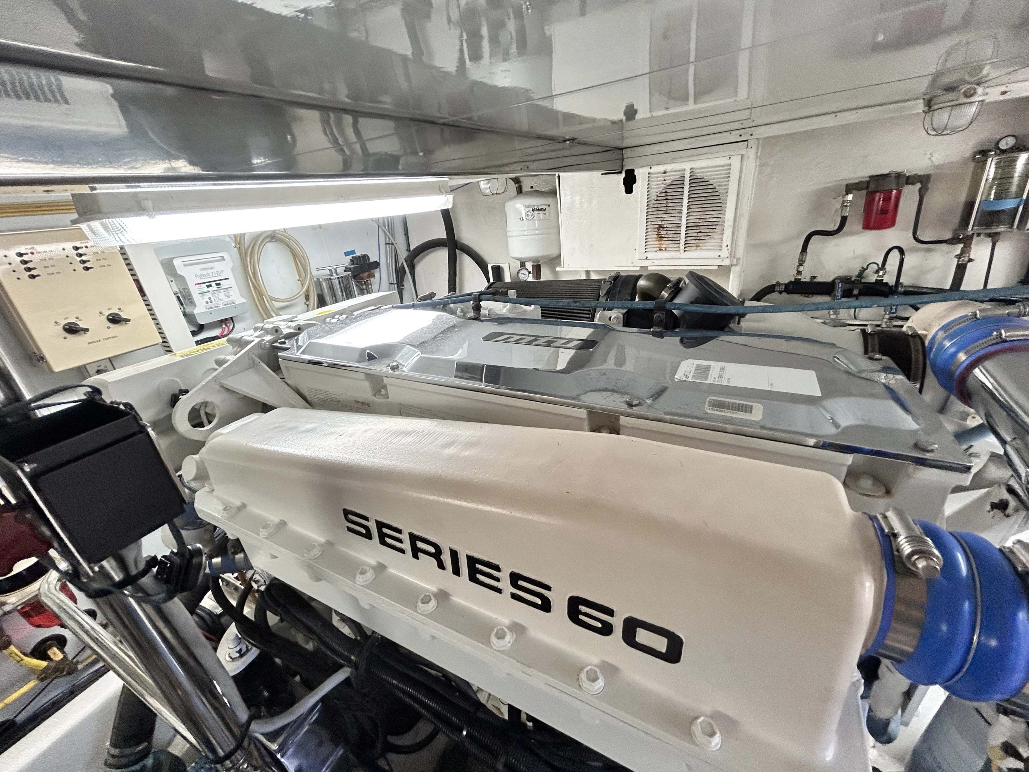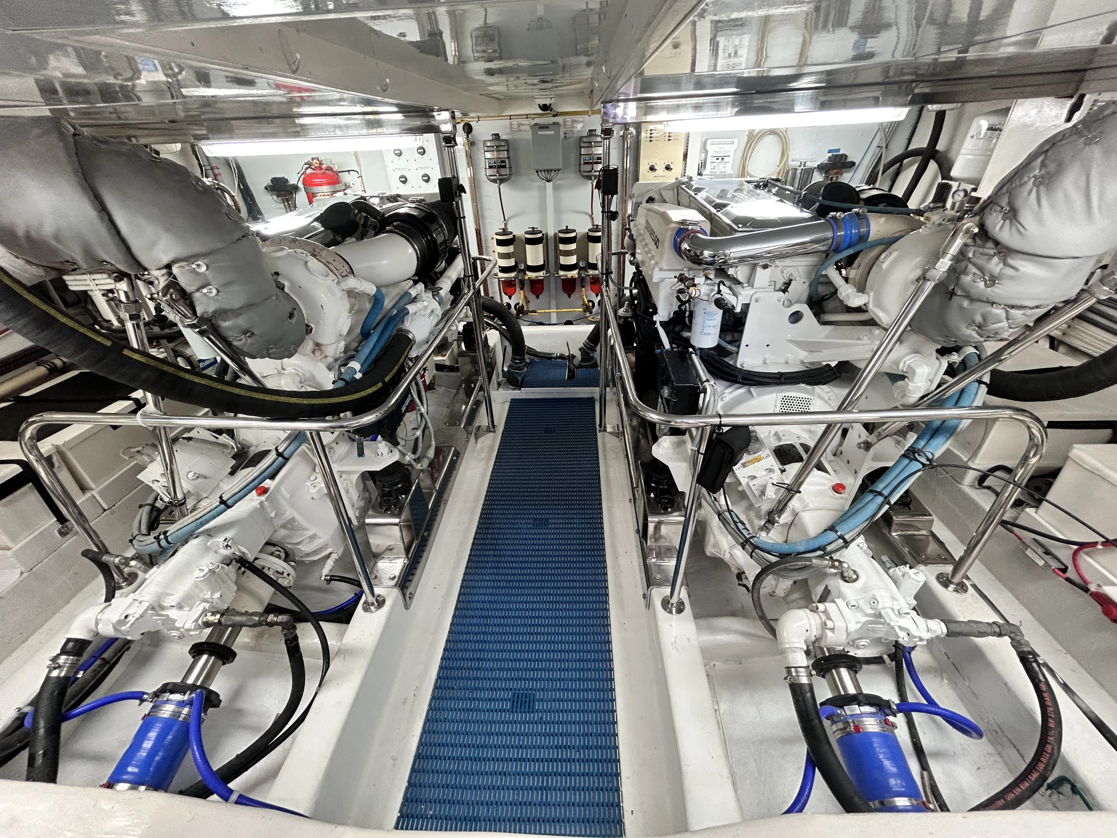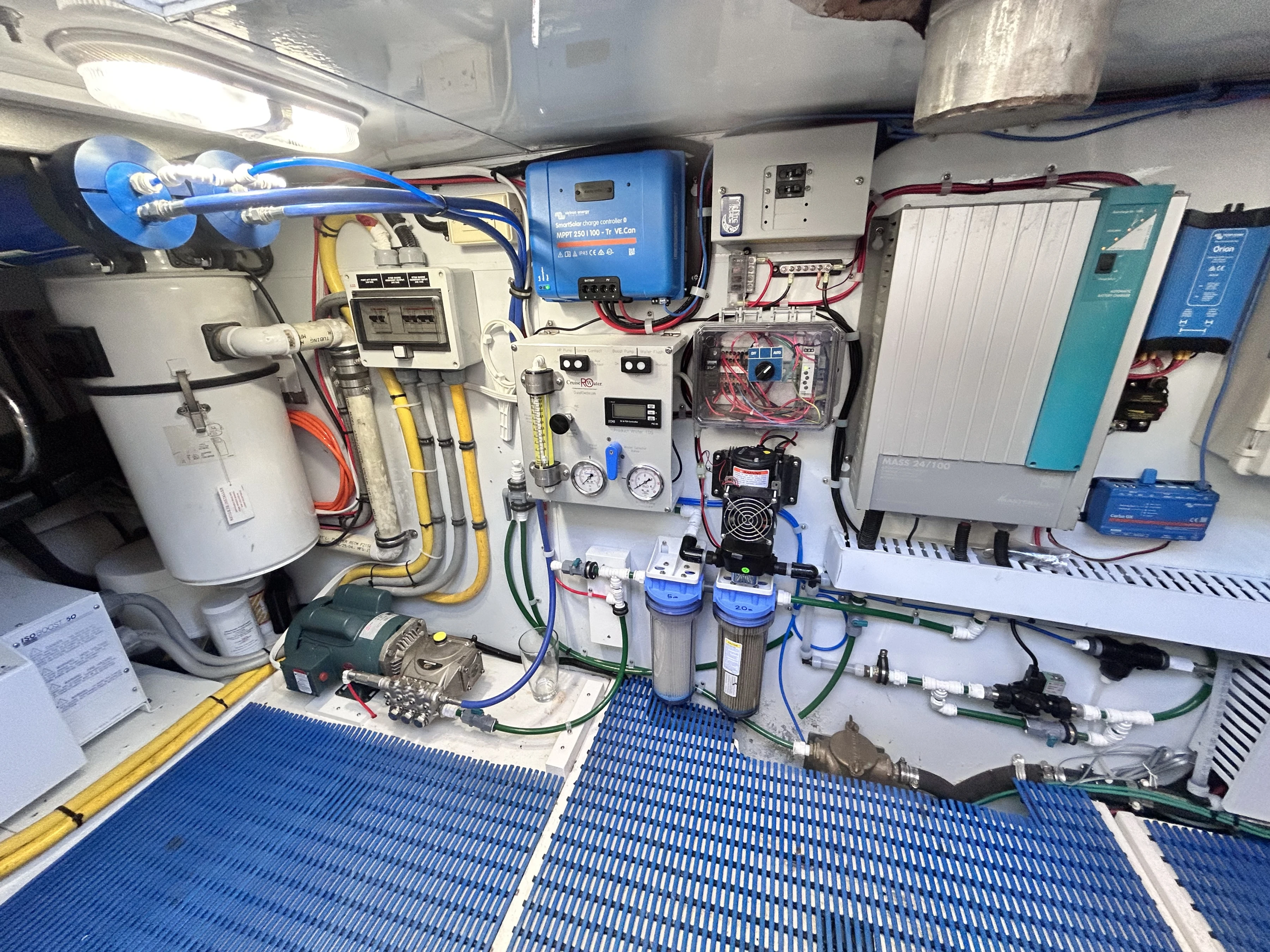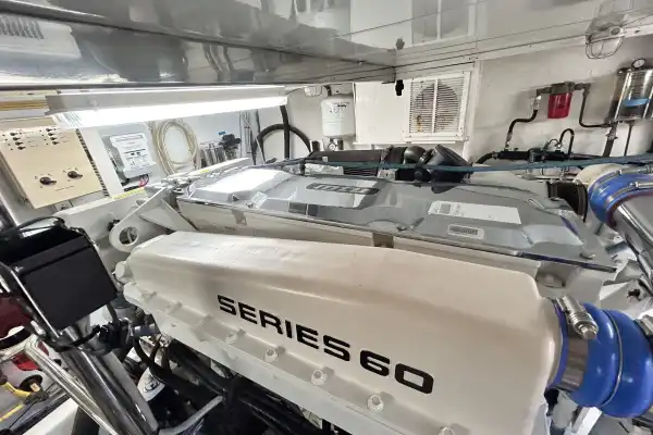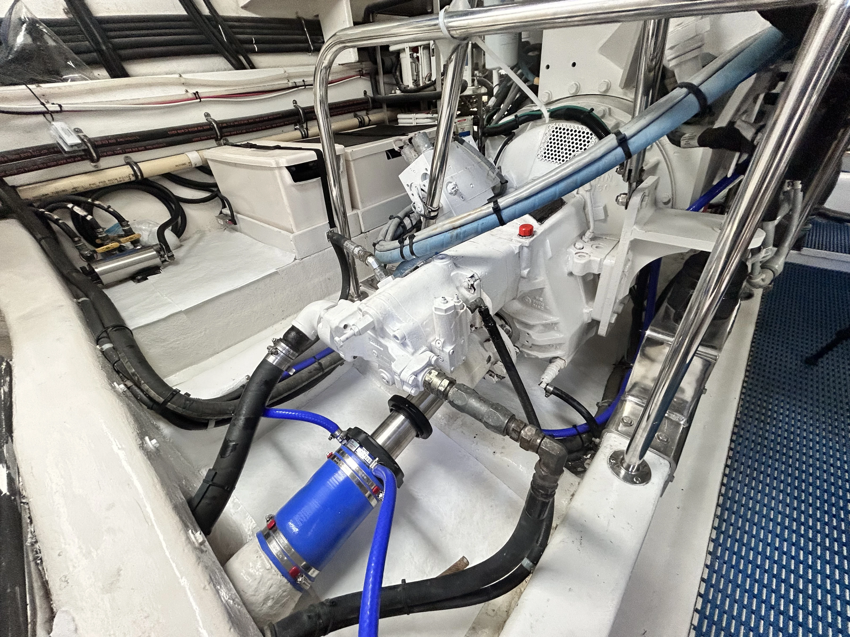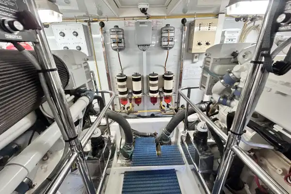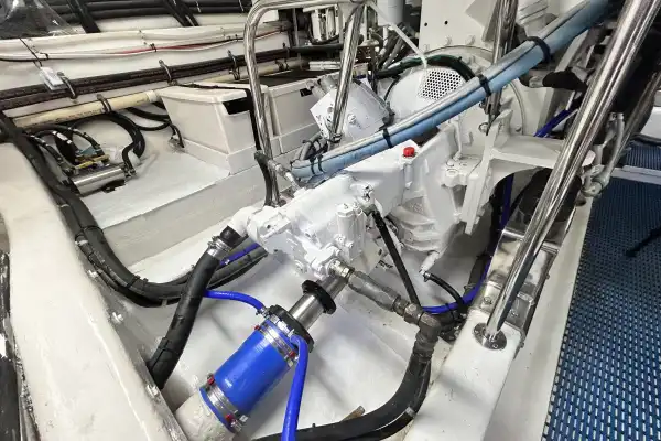 Finally, the engine compartment is located beneath the saloon with access via the cockpit. Its not standing headroom but there is good space to get around the engines for servicing.