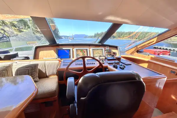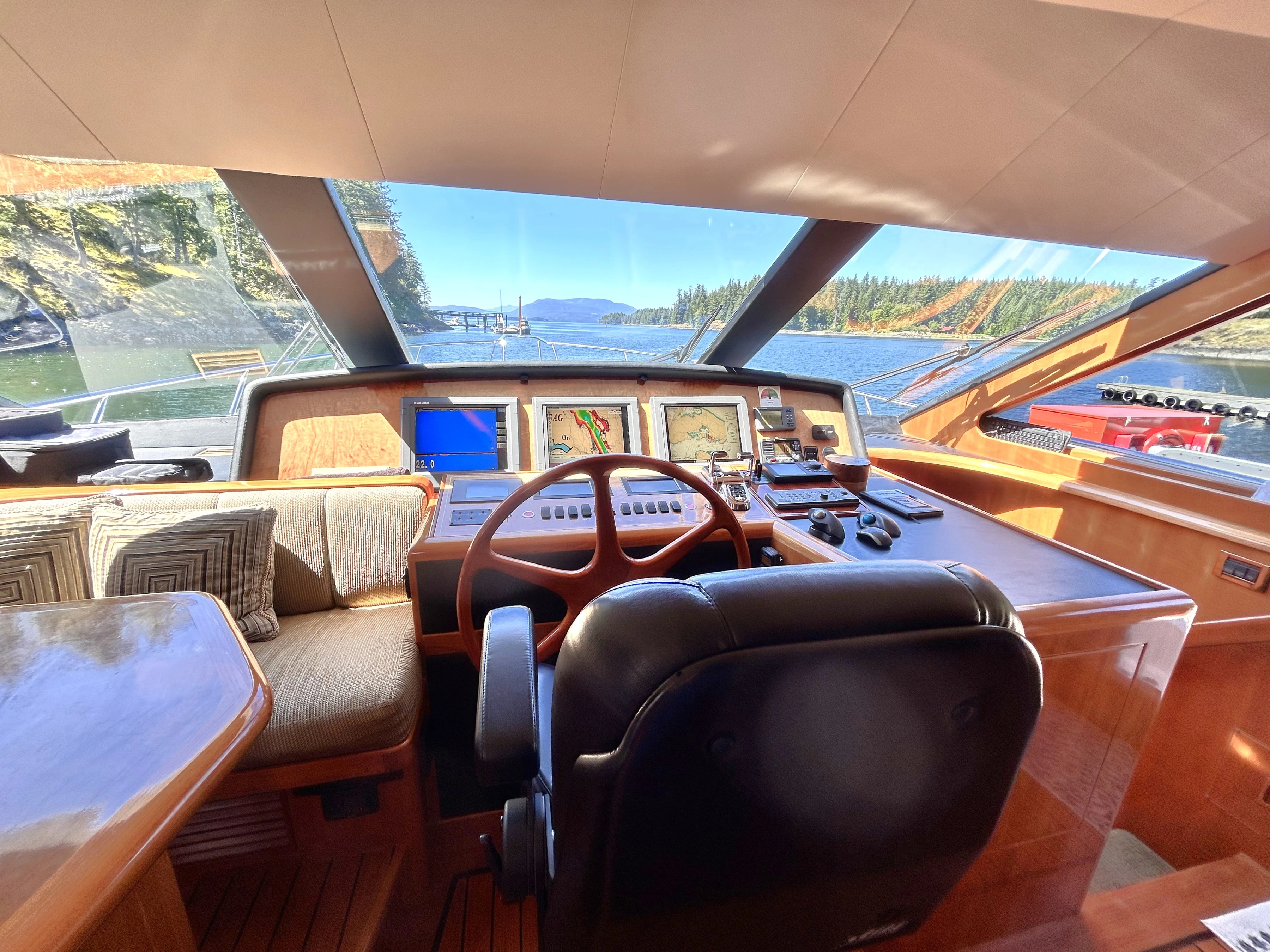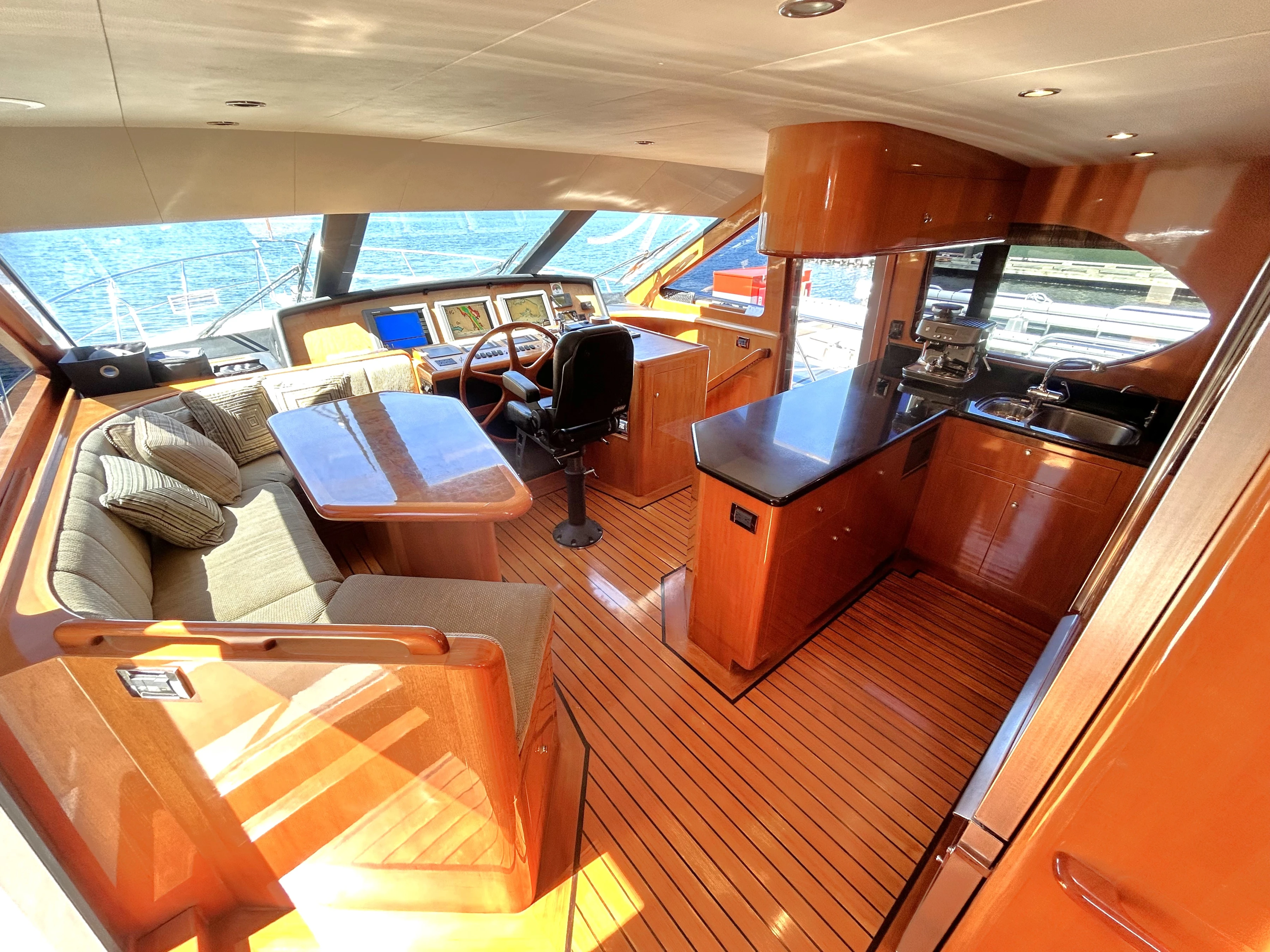 The lower helm has a large, secure captain’s chair in front of a beautiful wooden wheel. Three displays are laid out in front with all the controls needed to safely and efficiently navigate the vessel. The electrical center is starboard of the chair.
