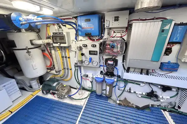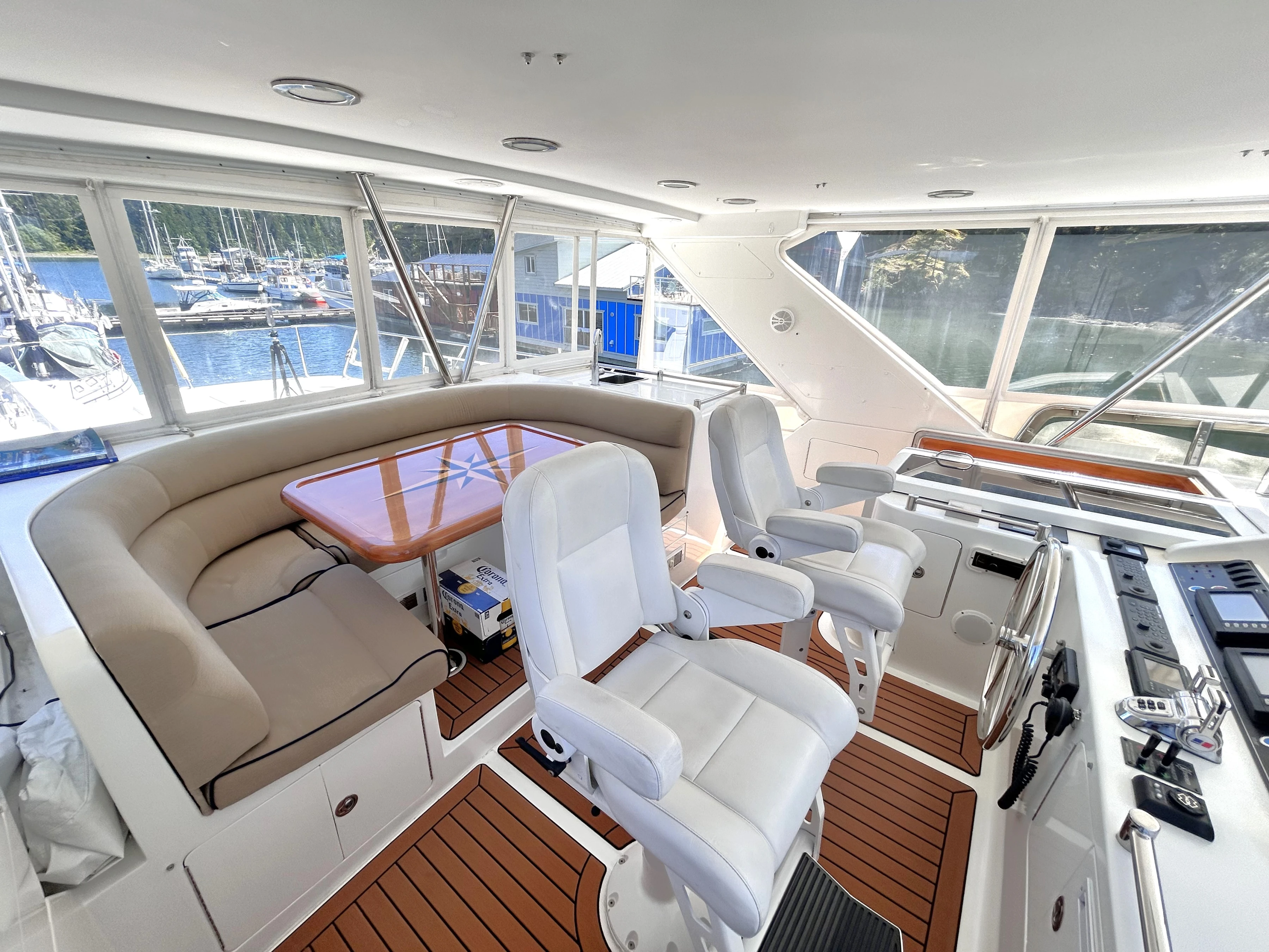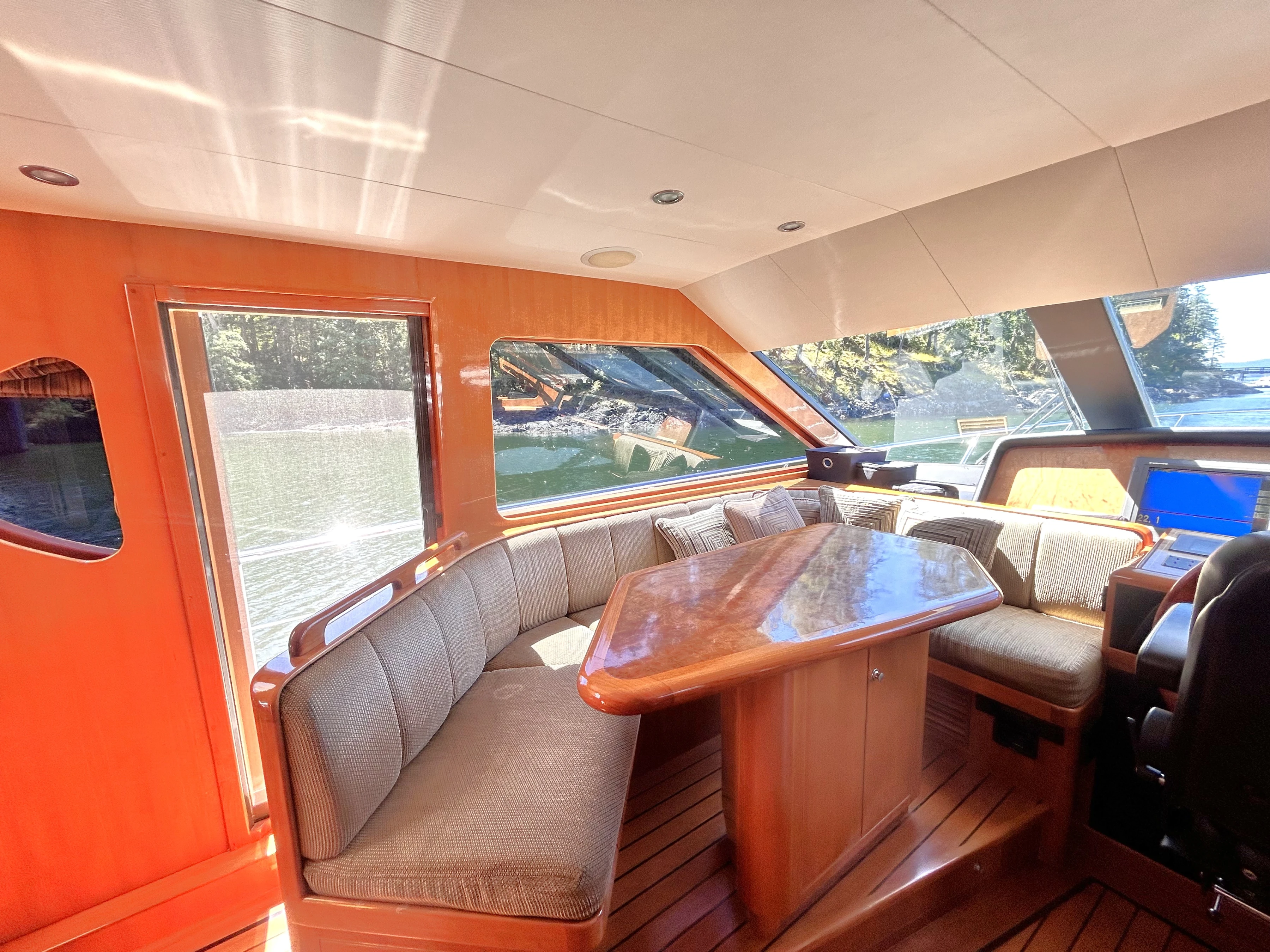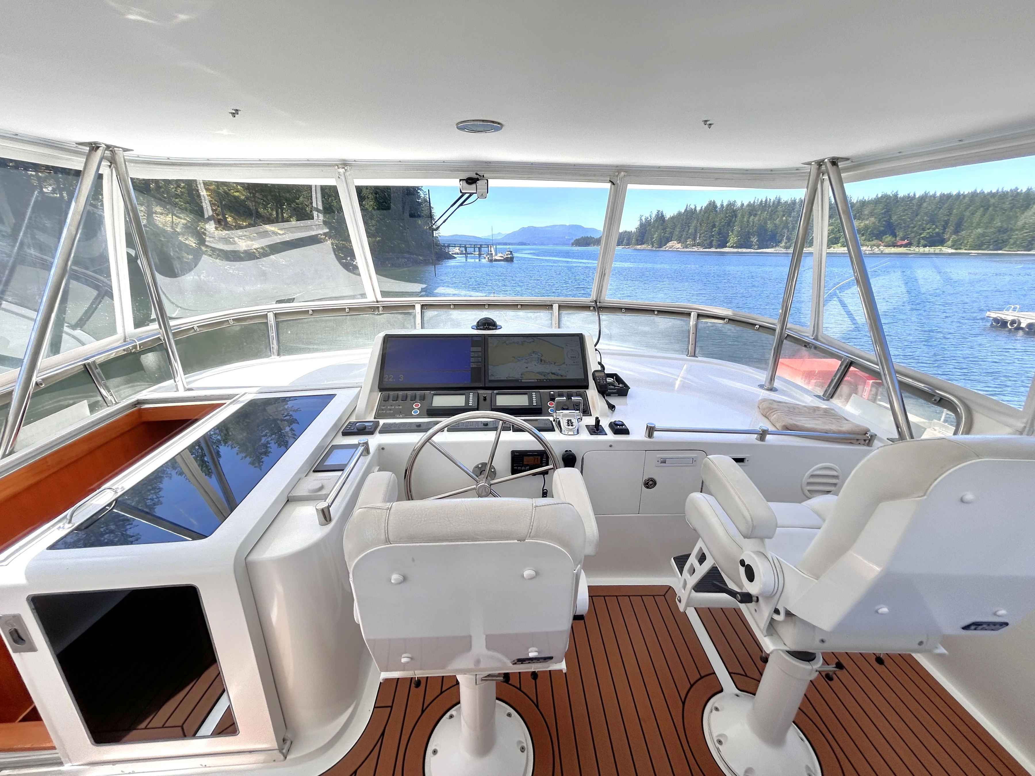 The lower helm has a large, secure captain’s chair in front of a beautiful wooden wheel. Three displays are laid out in front with all the controls needed to safely and efficiently navigate the vessel. The electrical center is starboard of the chair.