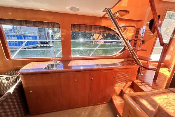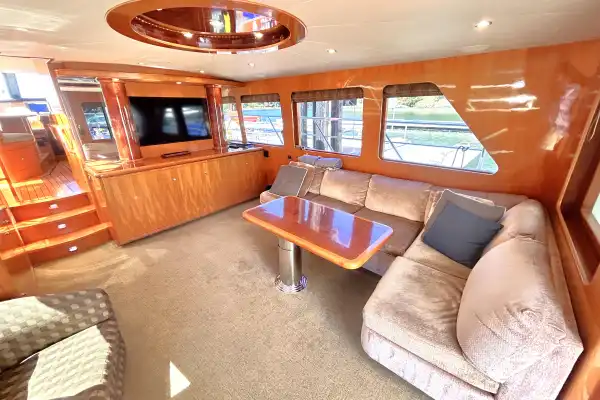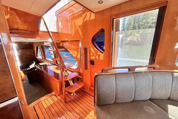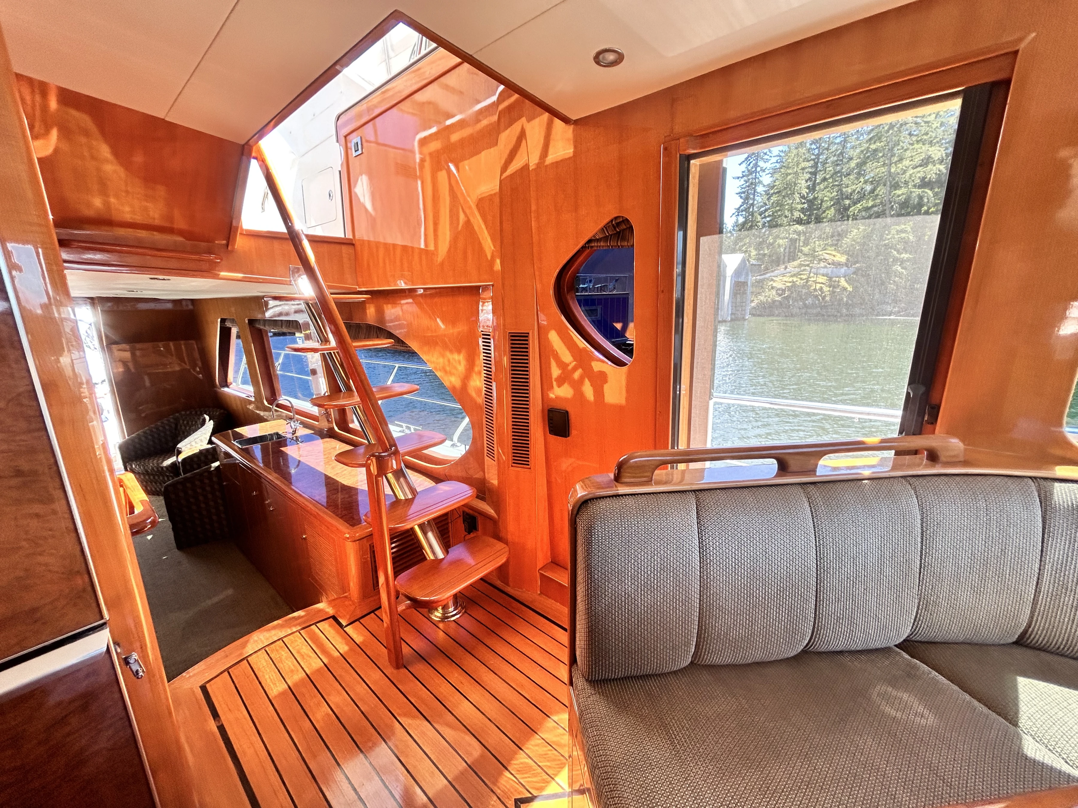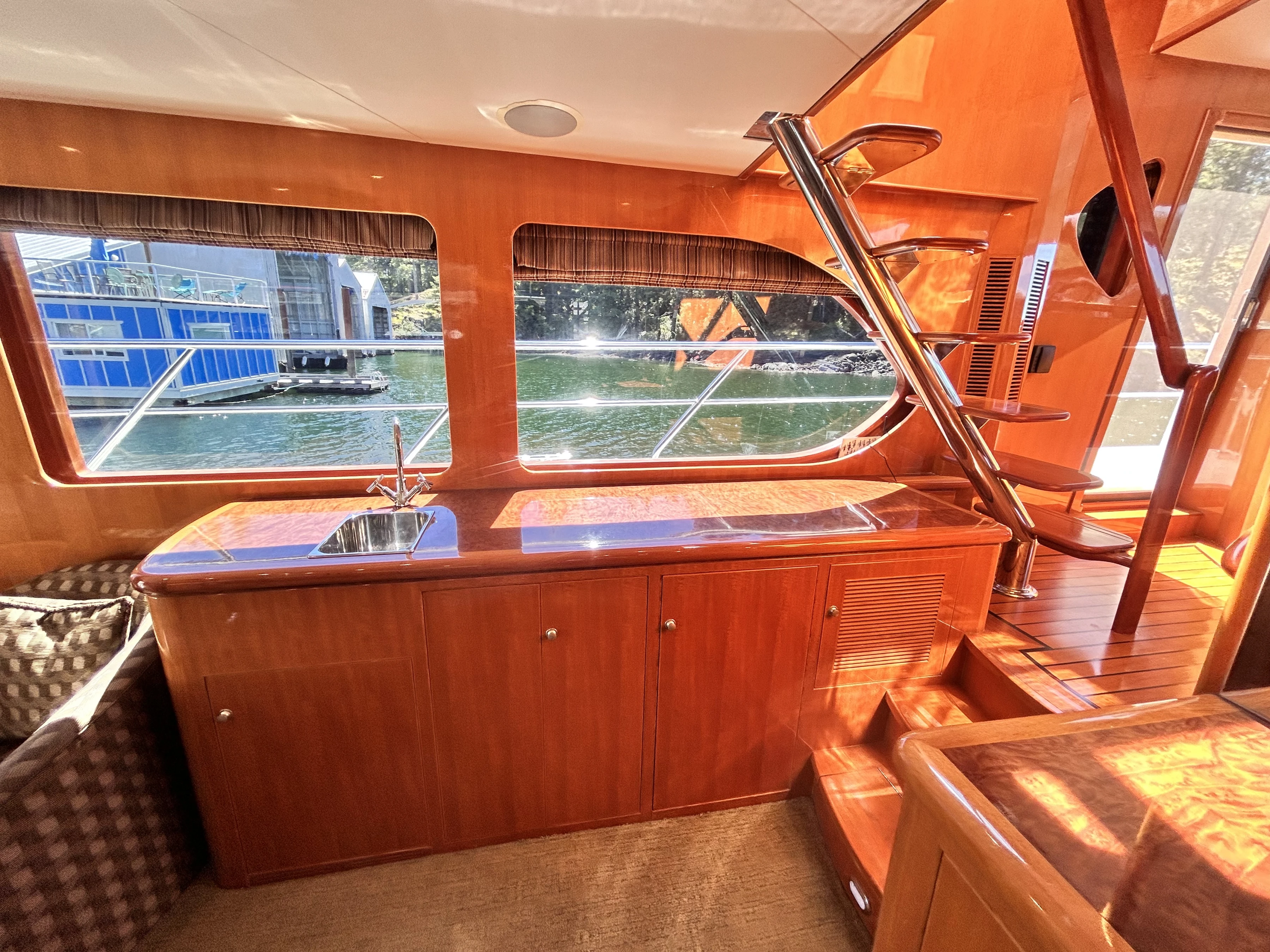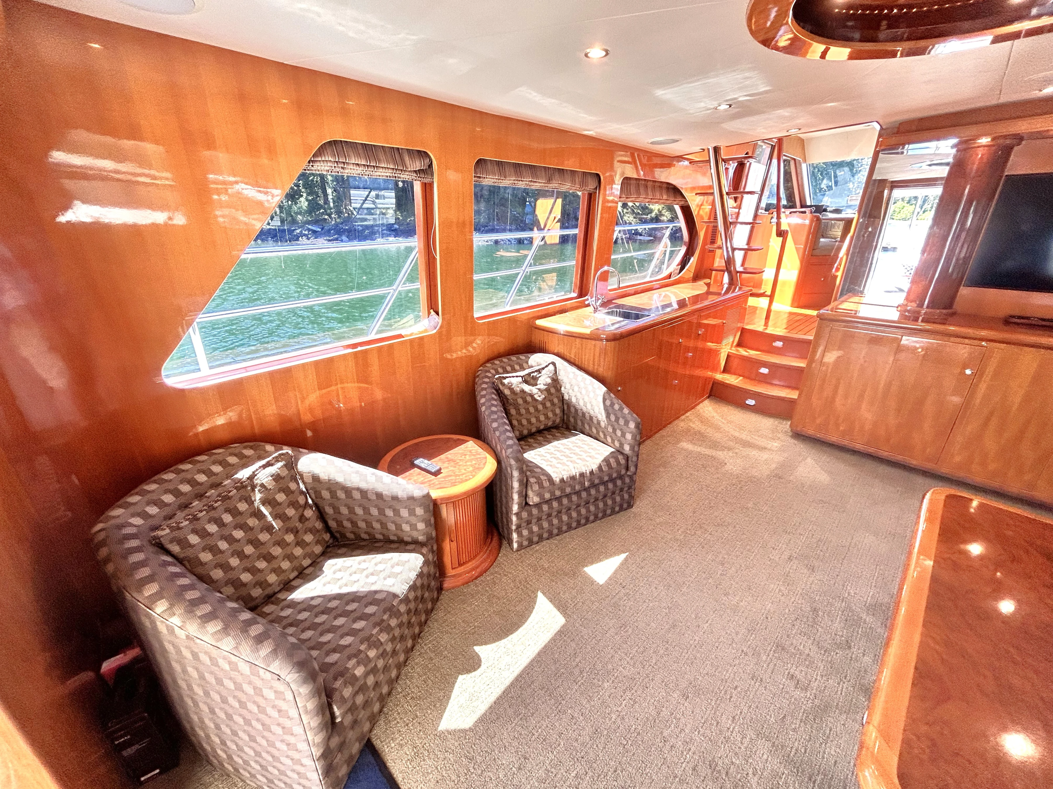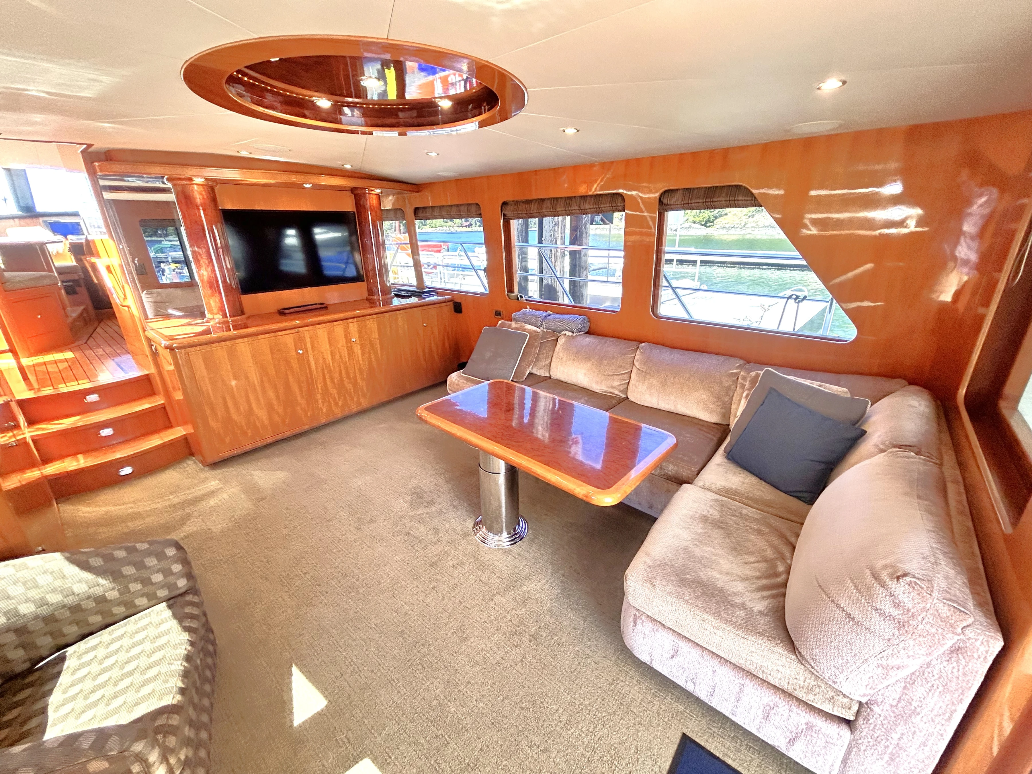 Meanwhile, return to the cockpit. If you walk through the sliding door you will arrive in the salon. To starboard is a couch and coffee table, to port are two plush chairs with a table in between. The fabrics and carpet are of soft greens and cream. Forward to starboard is a large flat-screen TV over a generous cabinet. To port is a wet bar. The wood is polished to a high gleam. Between those are 3 steps up to the next level. Overhead is a beautiful, round, recessed wooden centrepiece containing several pot lights, from which the paneling appears to expand from in a sunburst pattern. The room is surrounded by large windows, creating a bright and open space.