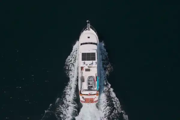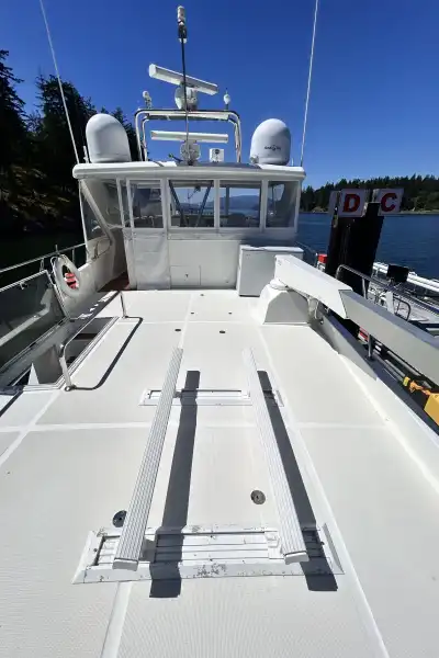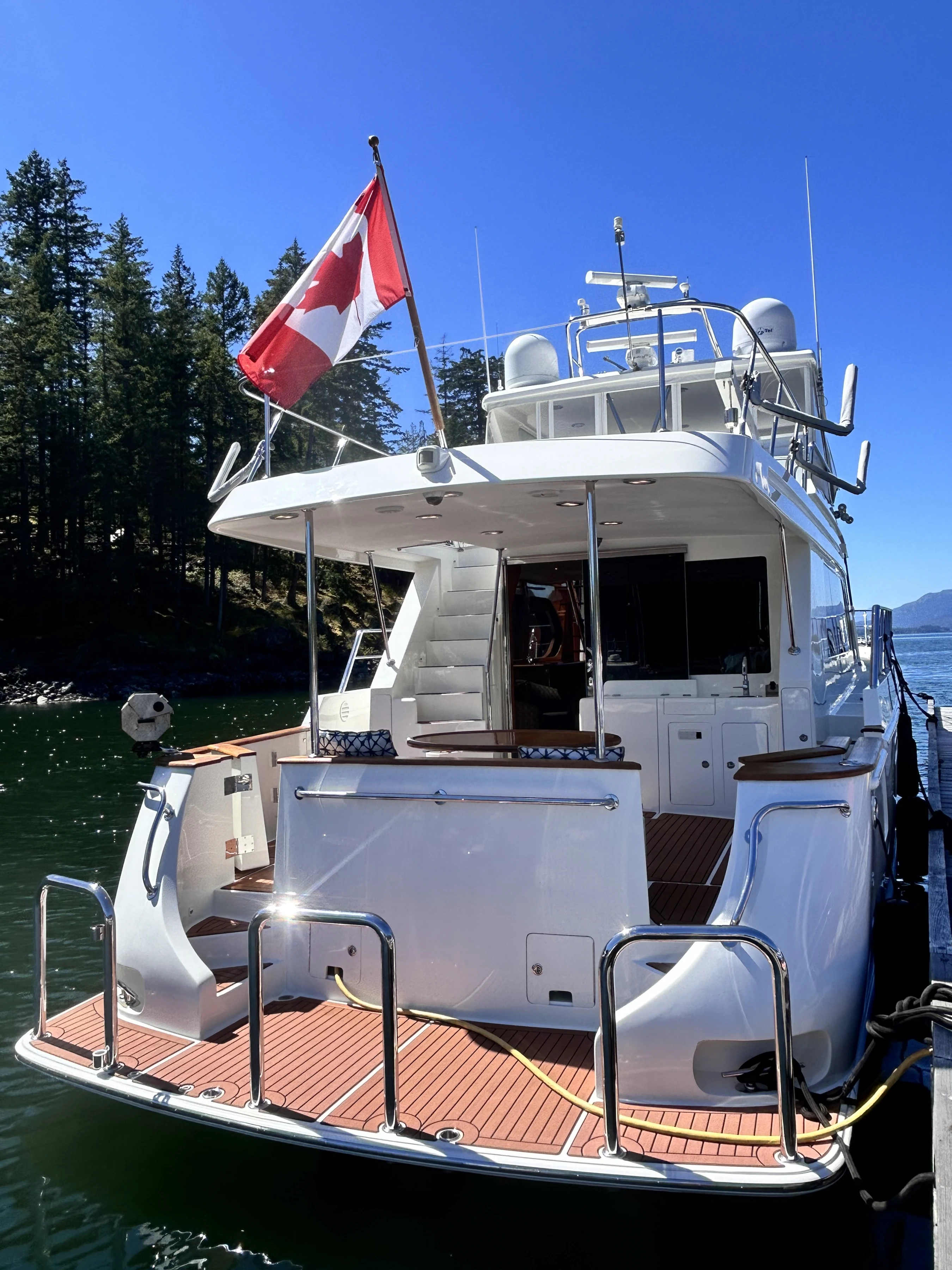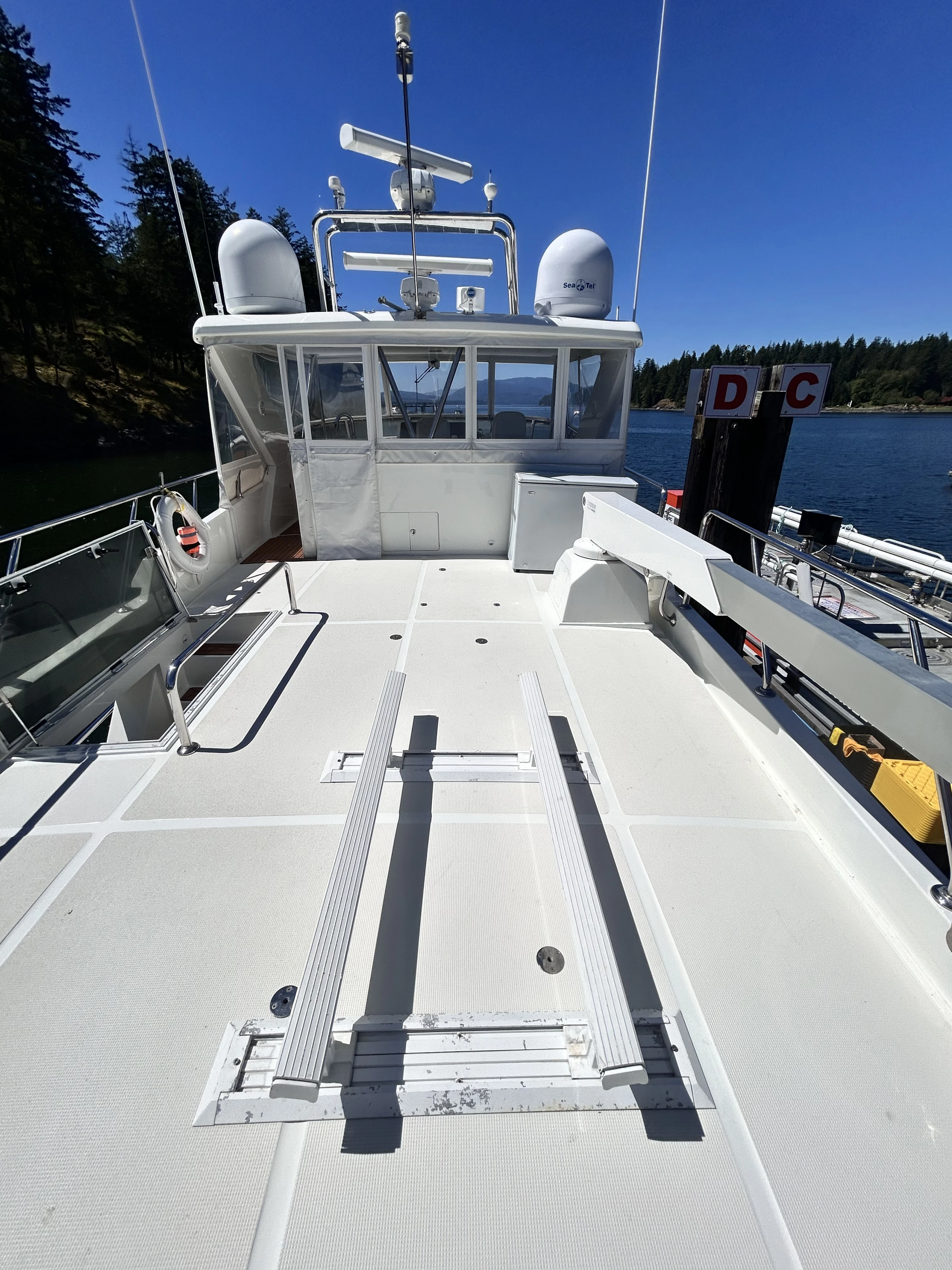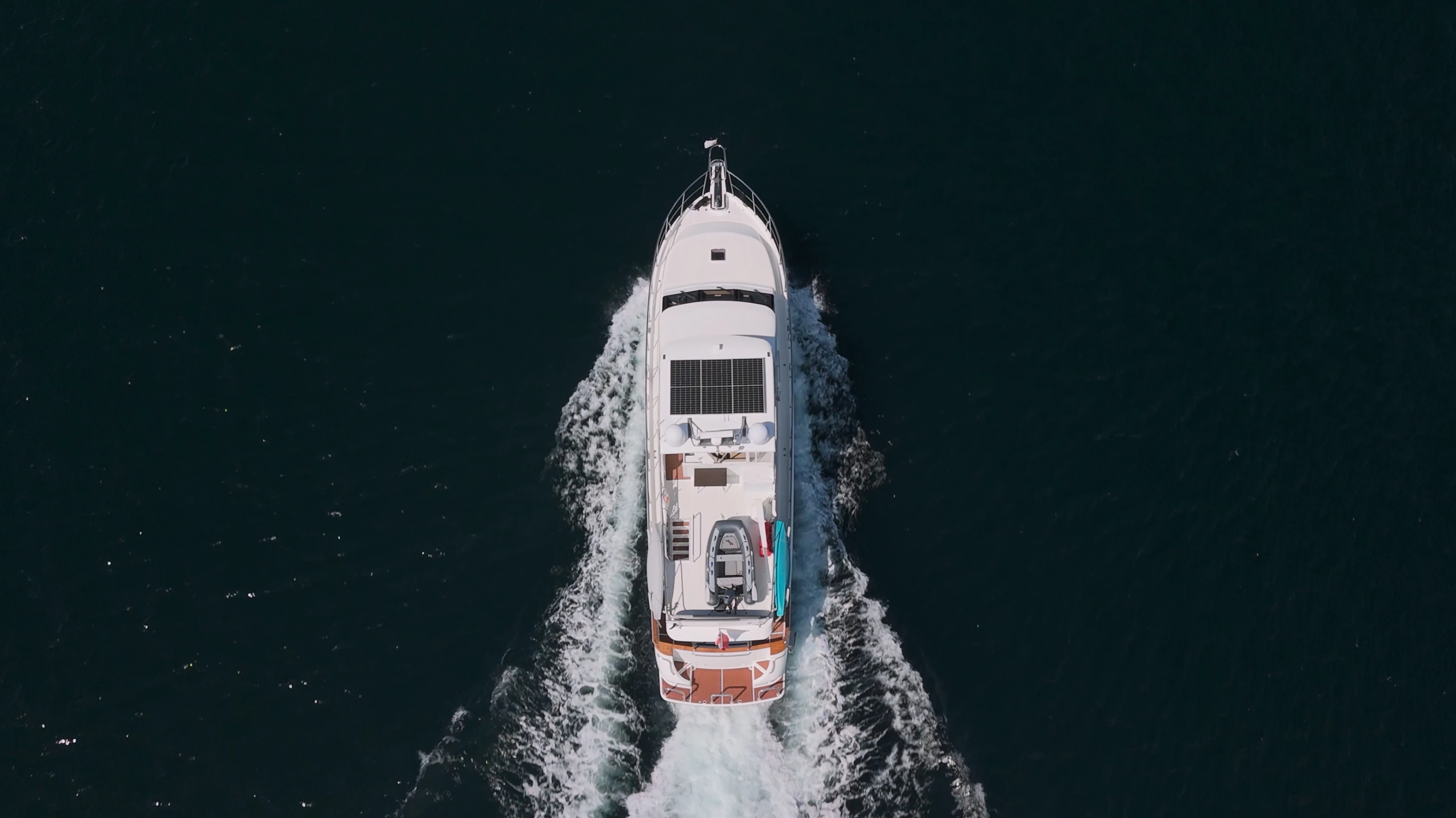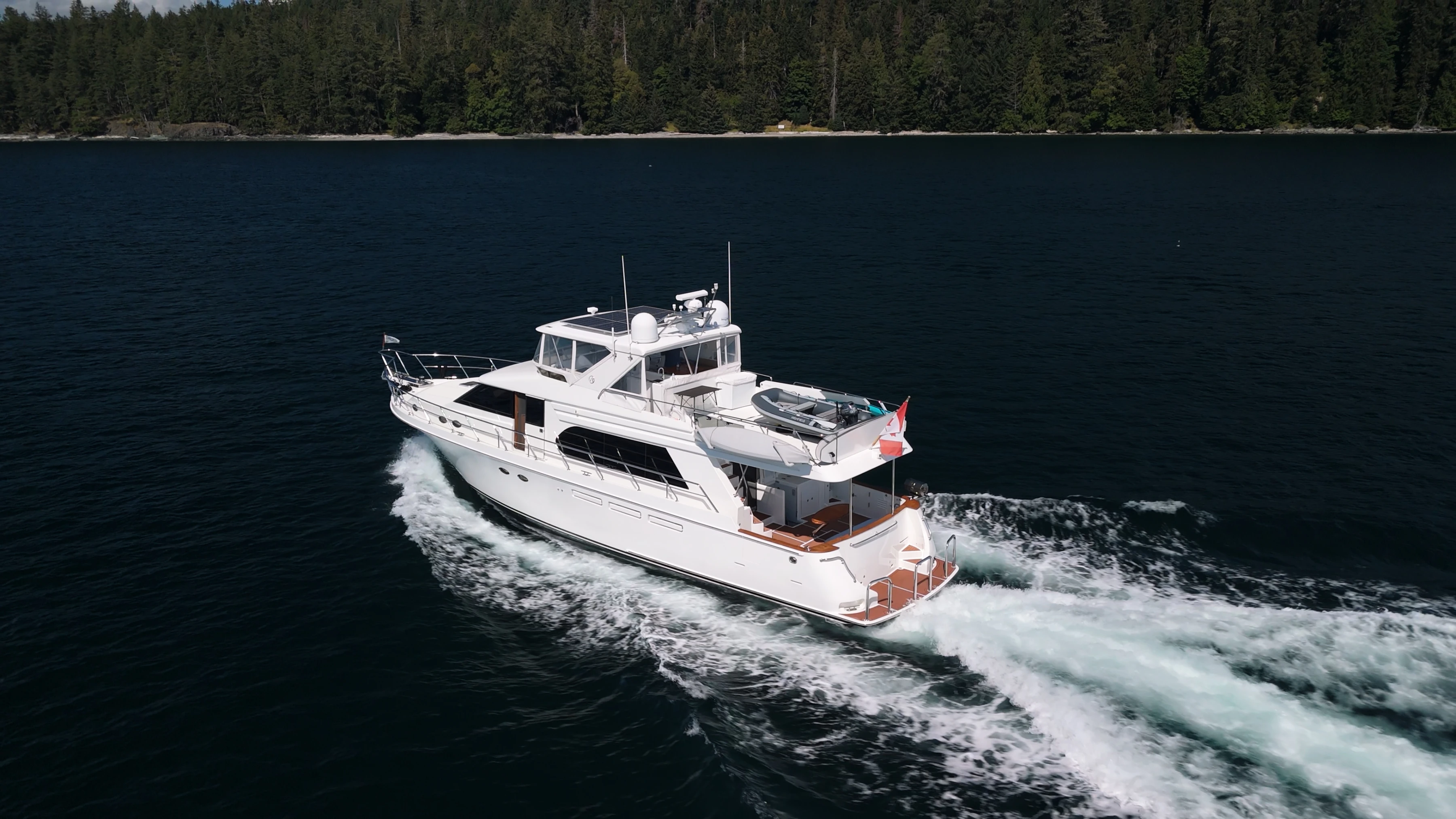 The deck of the flybridge extends over the entire vessel, affording plenty of space for the tender, as well as providing complete overhead coverage for the cockpit below.
