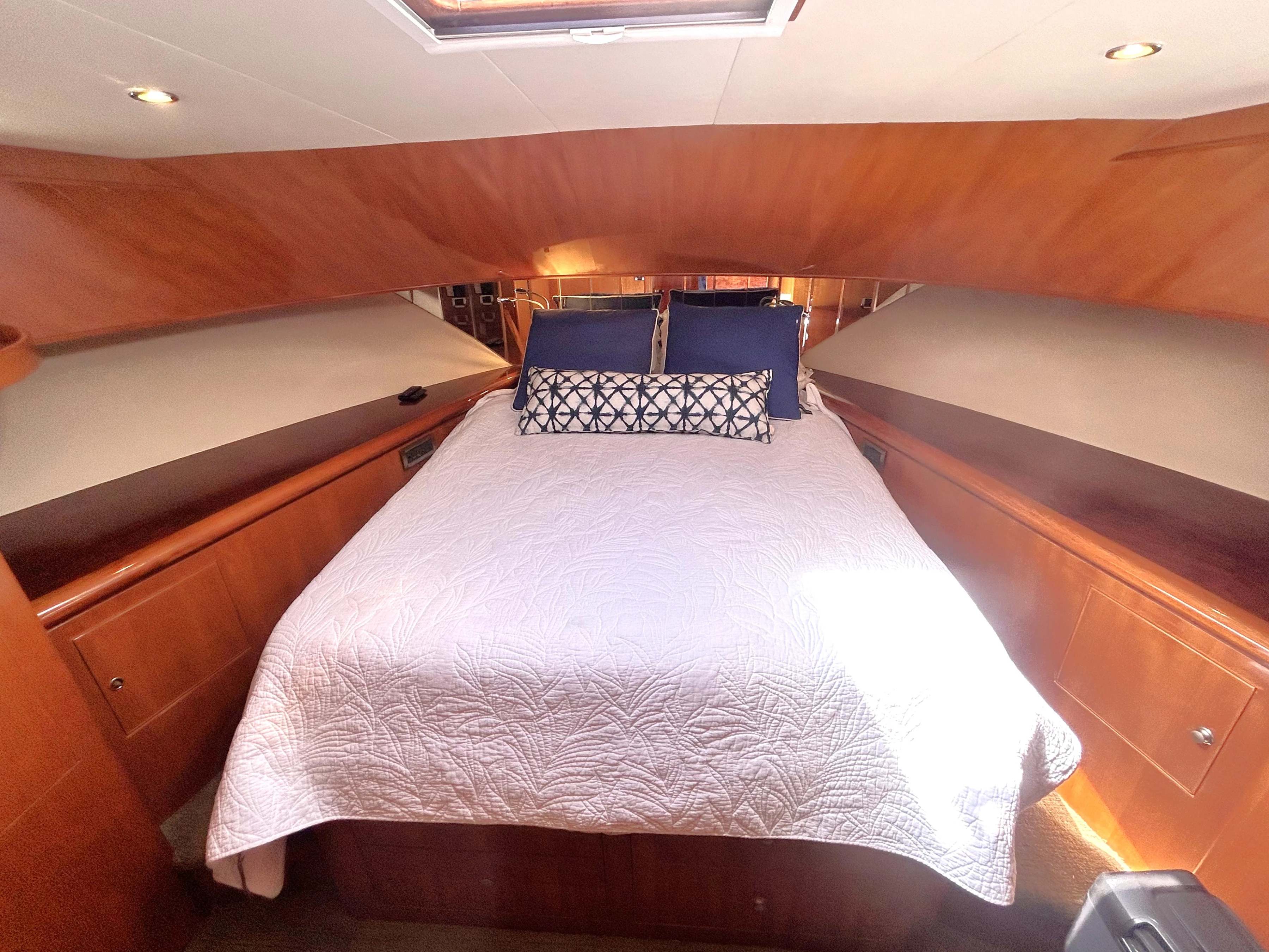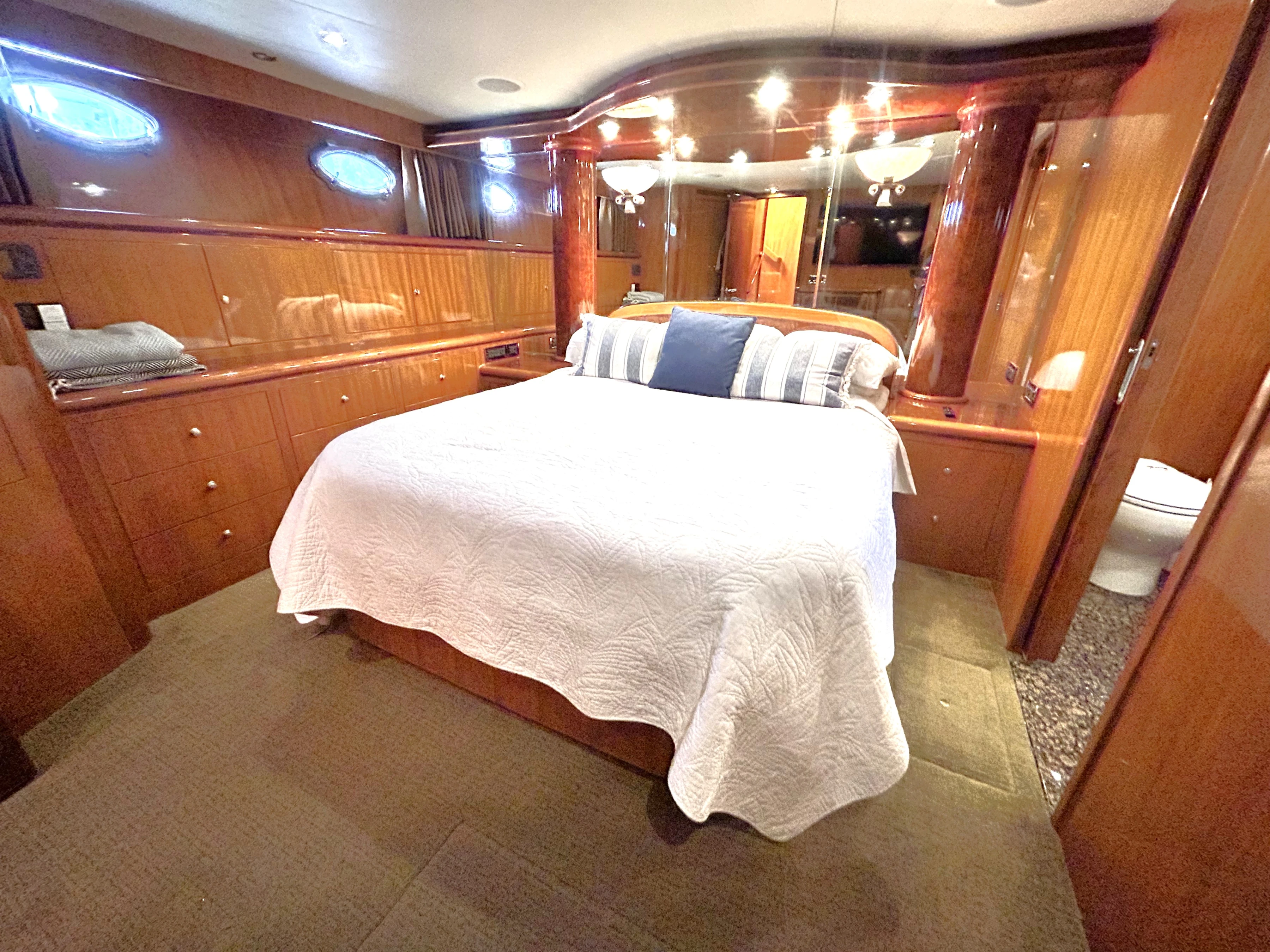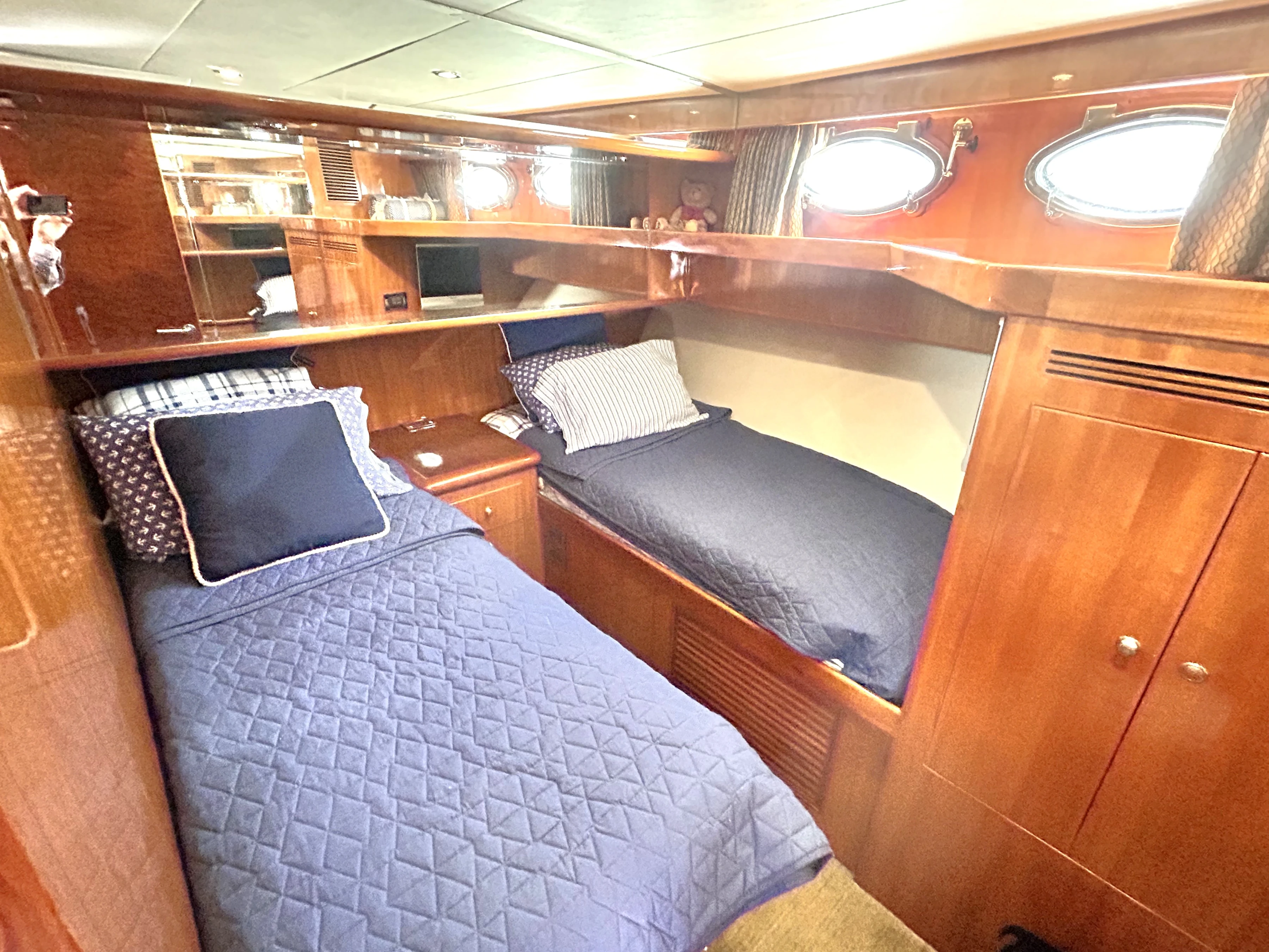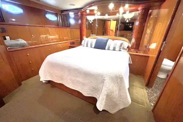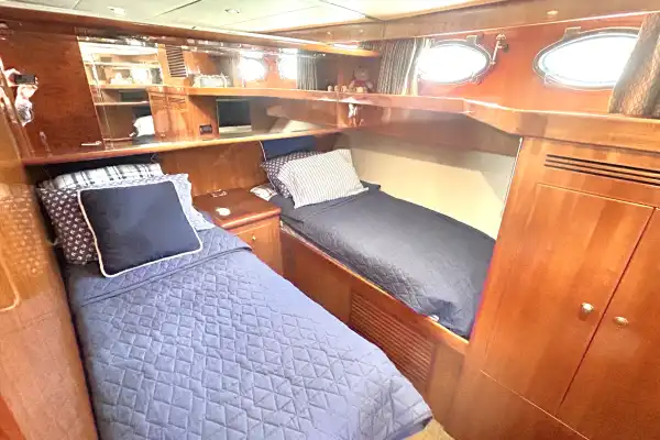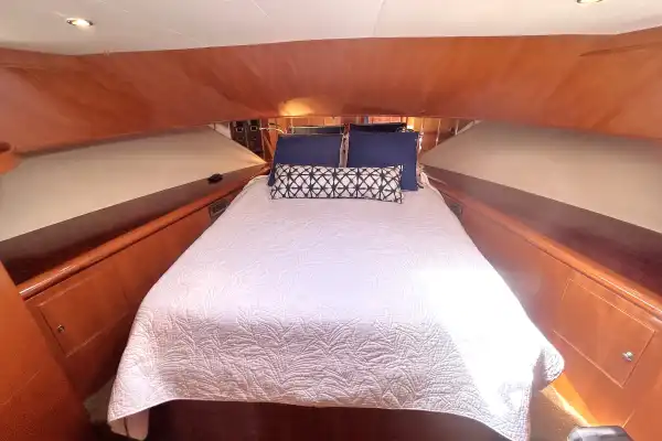 The VIP stateroom is forward. The queen berth has 2-sided access. There are also 2 generous hanging lockers, cedar lined, as well as ample shelf storage in this stateroom. There is a TV here as well.
