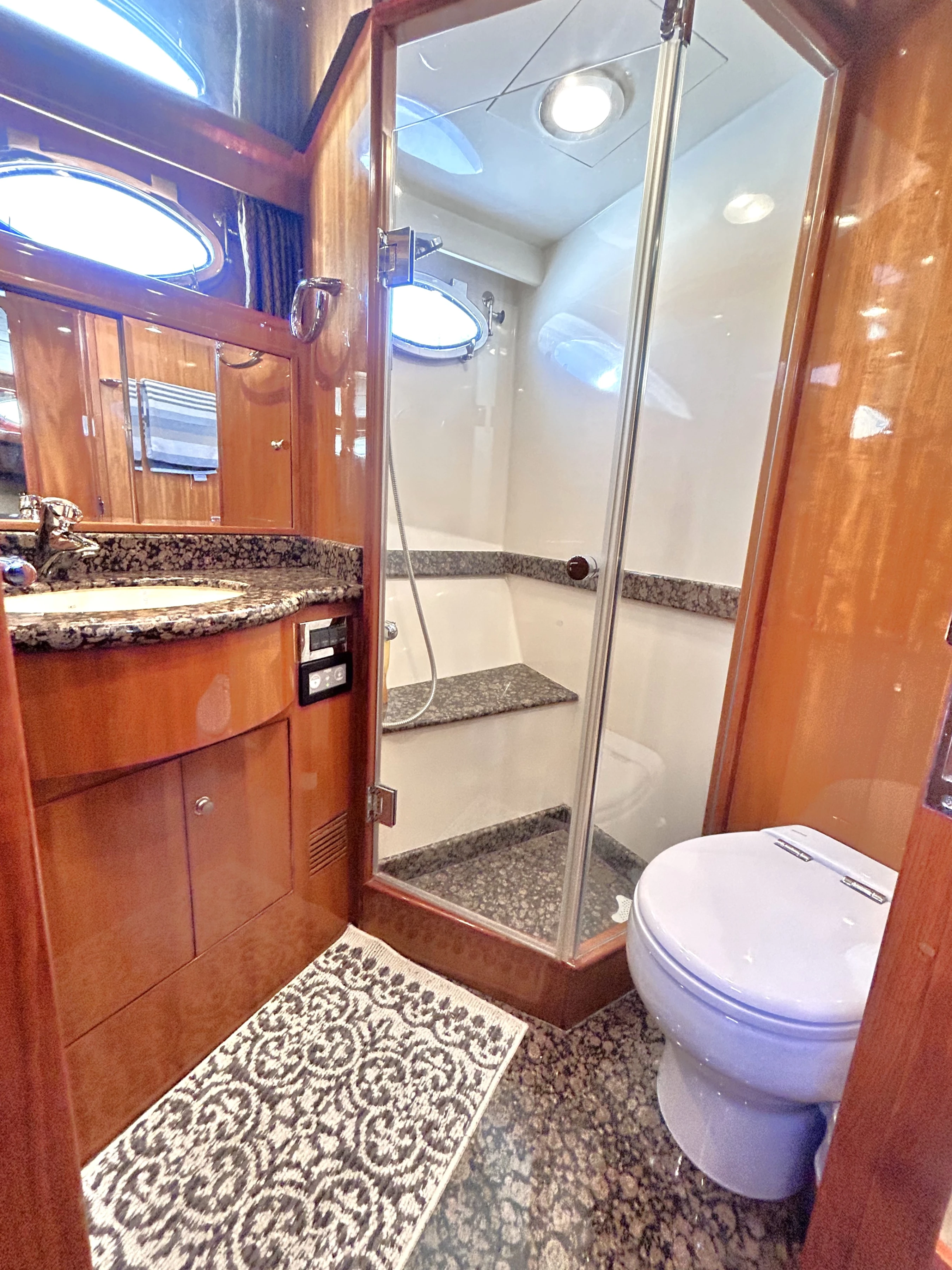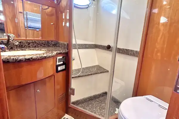 Moving forward, the first door on the right is a shared head for the VIP and guest staterooms. It has a granite vanity, a basin, an electric flush toilet, and a separate shower stall.
