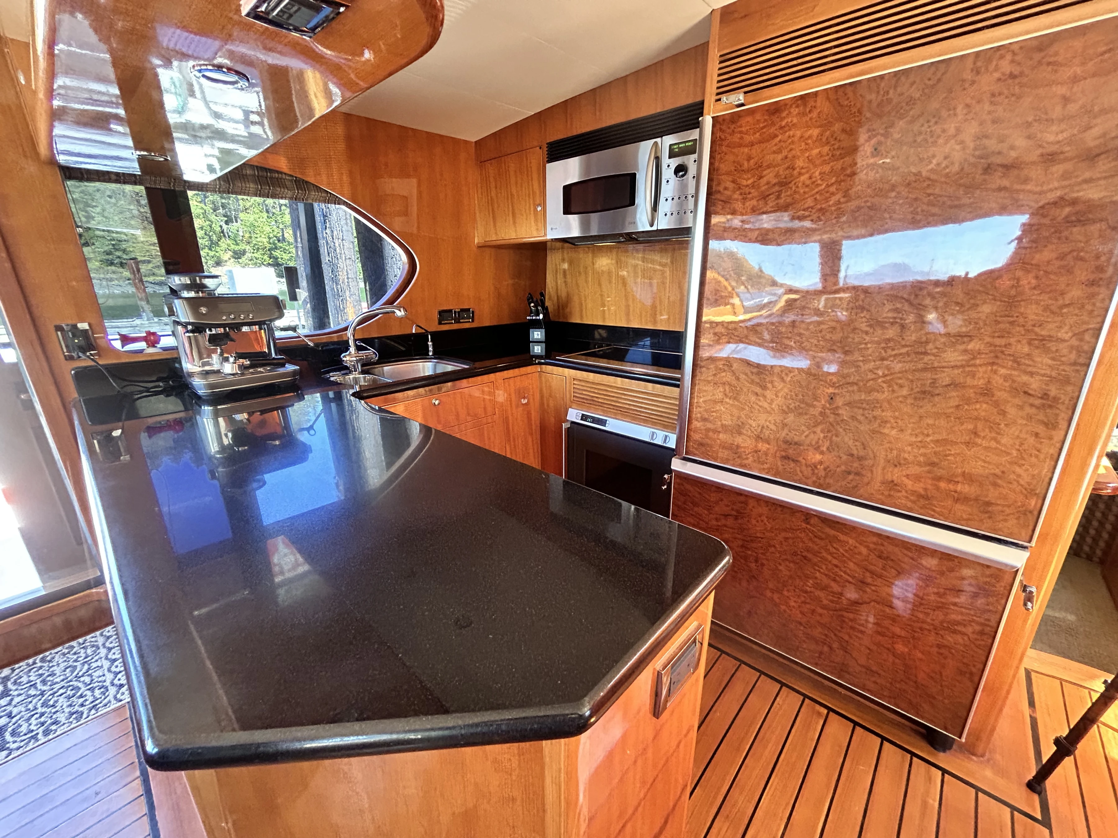The long U-shaped galley has an exceptional amount of counter space and storage with all the features you would expect. Full-sized fridge-up-freezer-down, electric stovetop, oven, microwave, dishwasher, large sinks, and trash compactor.
