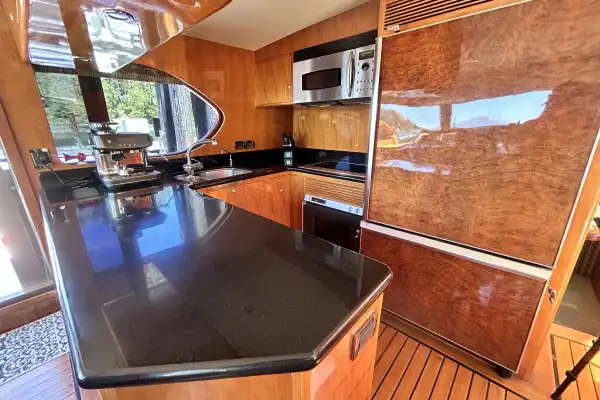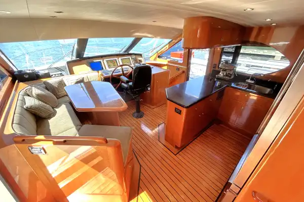 At the next level forward you will find the full galley to starboard, a raised C-shaped dinette for 6 to port, and the main helm forward.