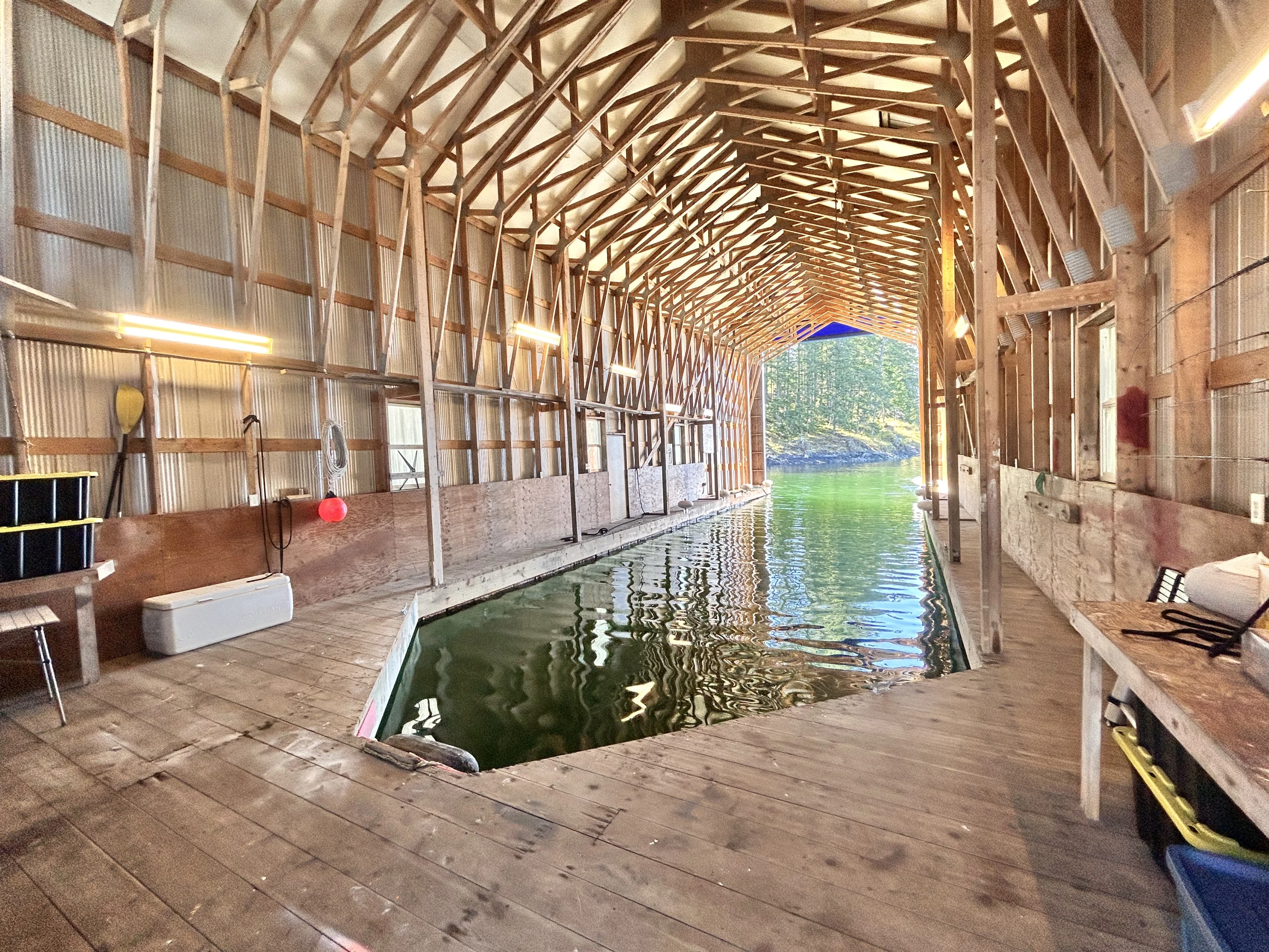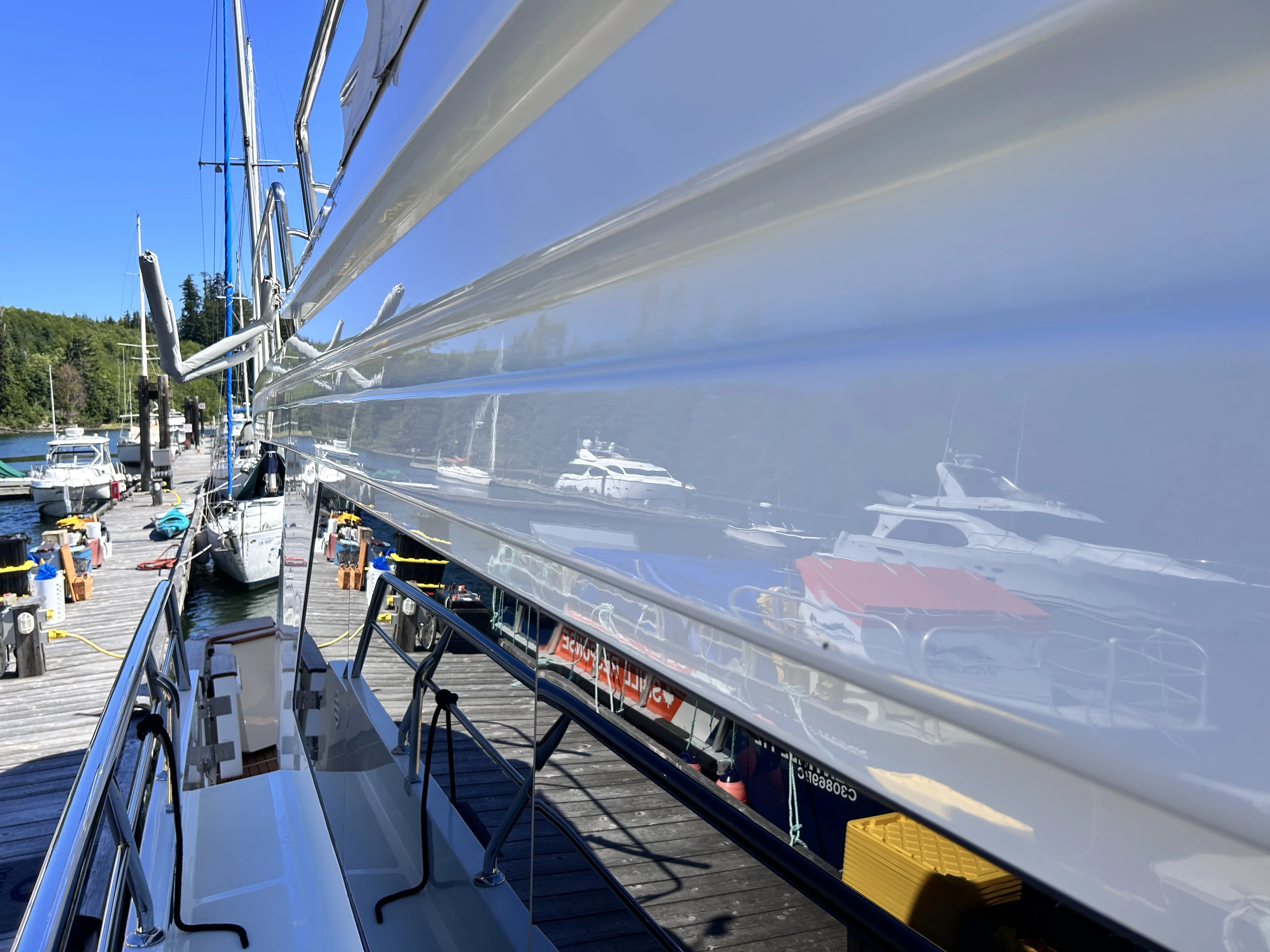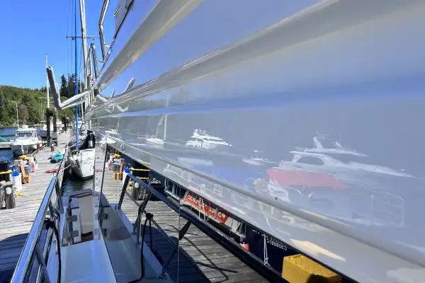Against the starboard side is a sink-and-a-half. Having that ½ sink aboard is nice because it provides a place to hold water without giving it too much room to slosh about while underway. Looking forward, there is a long uninterrupted countertop that runs athwartship, wonderful for preparing food. Below is an exceptional amount of storage.