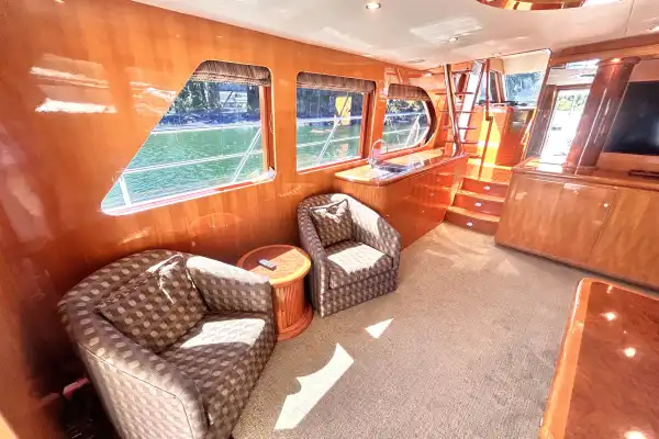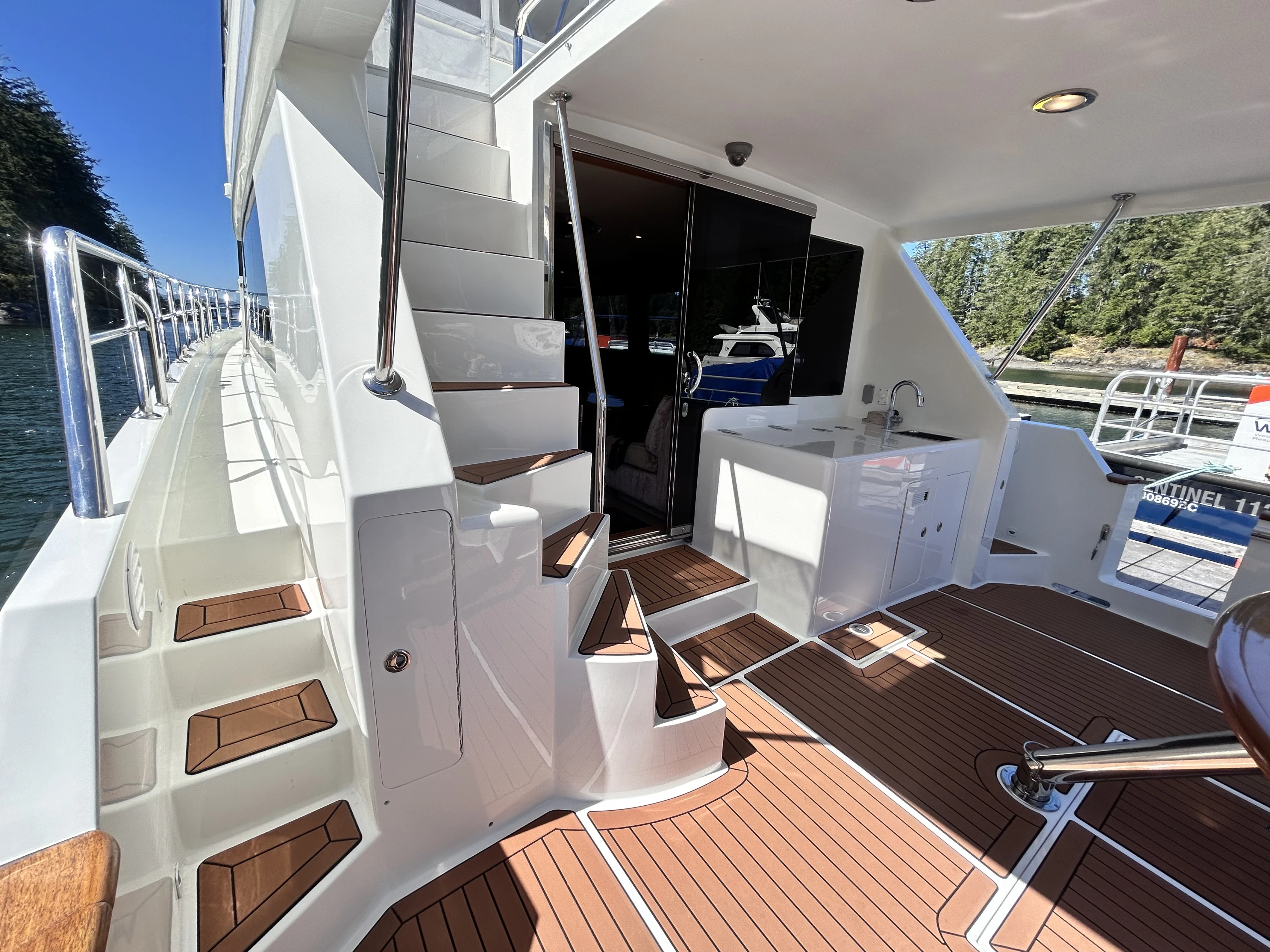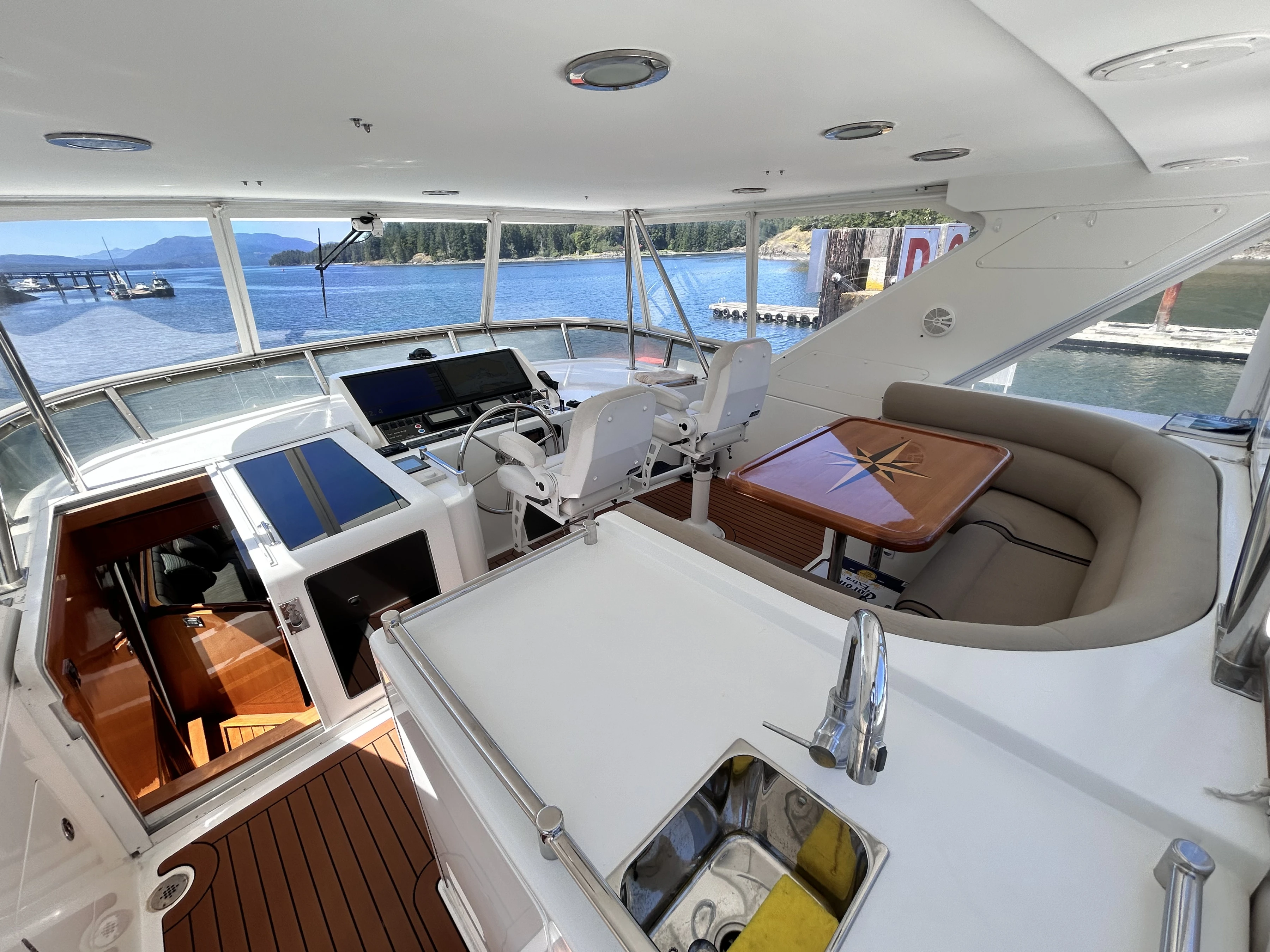 At the top of the stairs up to the flybridge, you will find the tender cradle to your right with a Steelhead Marine crane. Ahead of that is a large deep freezer. There’s a walkway to port leading to a wet bar and the flybridge helm. To port is a set of elegant stairs leading to the lower helm/galley/dinette area. Starboard of the stairs, there is a curved sitting area behind the upper helm. There are two captain’s chairs that can swivel to face the dinette table creating an area for 6 people to visit and dine.