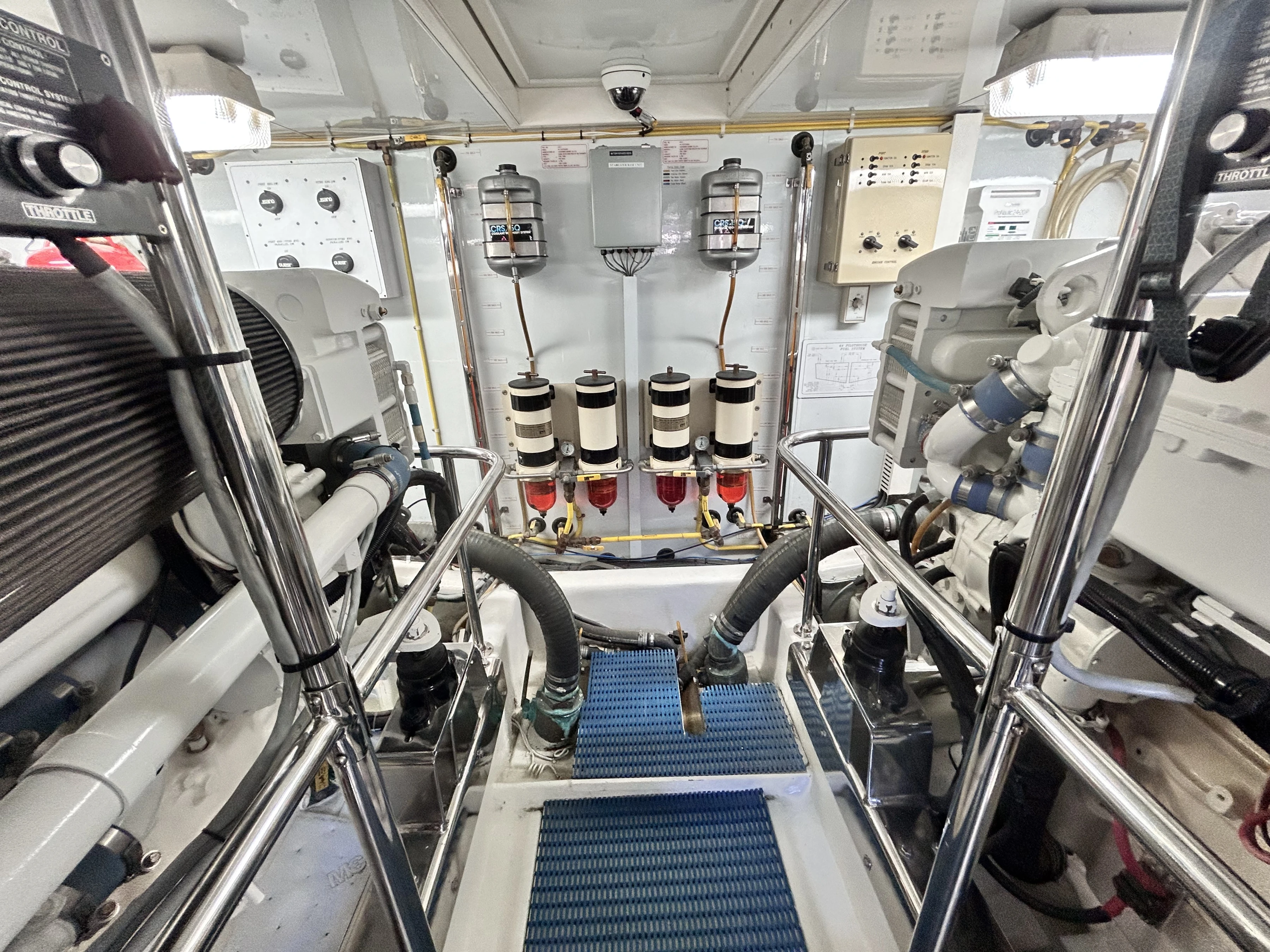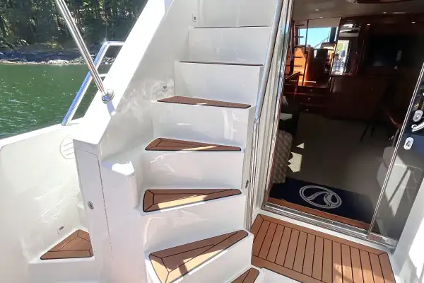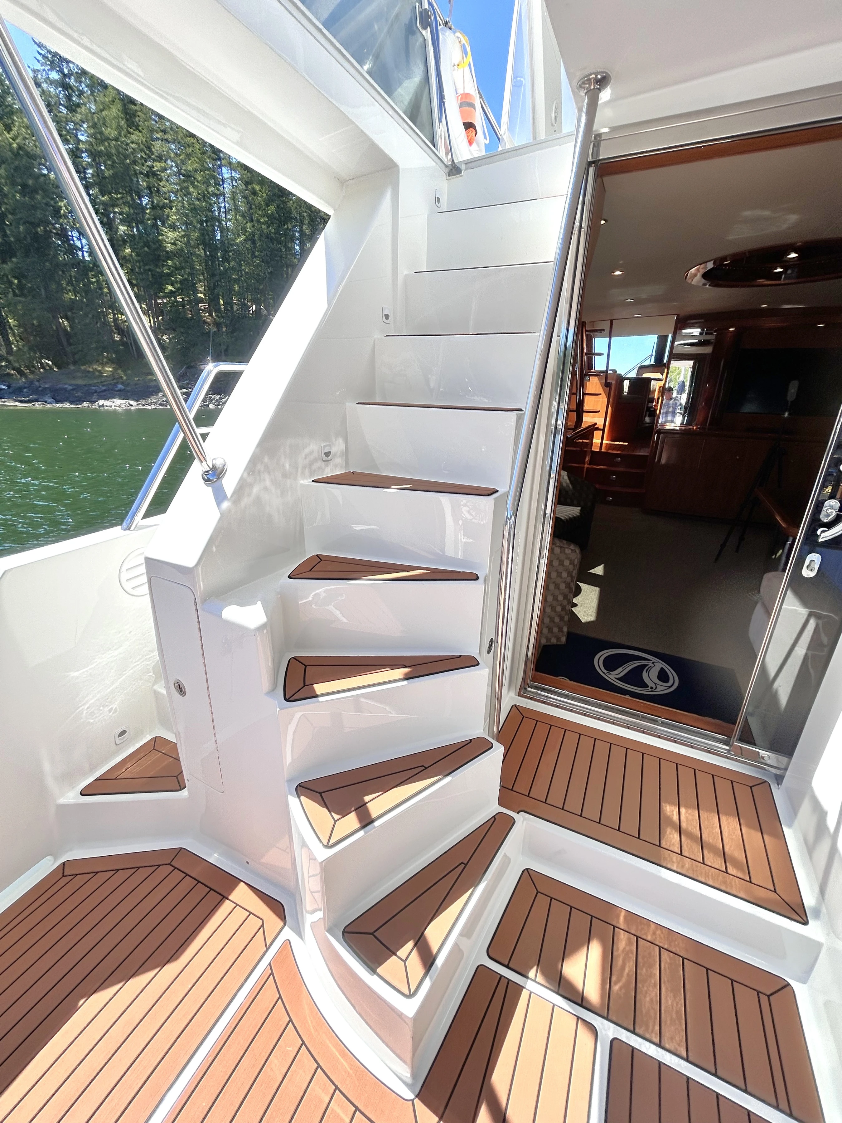 Starboard to the helm and electrical panel is a staircase leading to the lower level with its 3 staterooms and 2 heads.