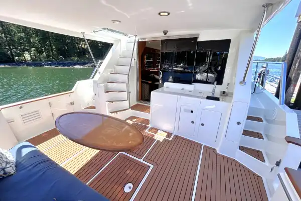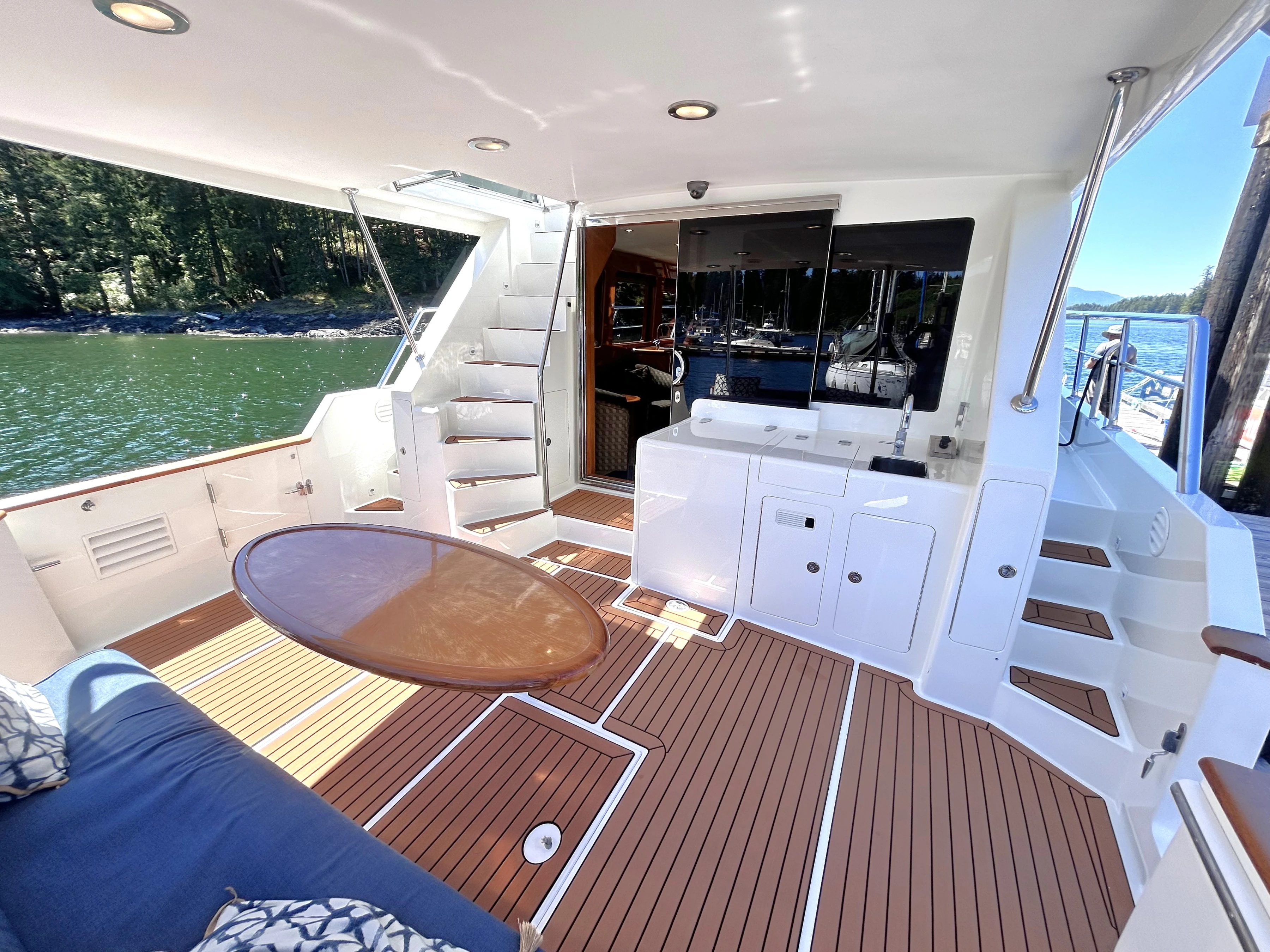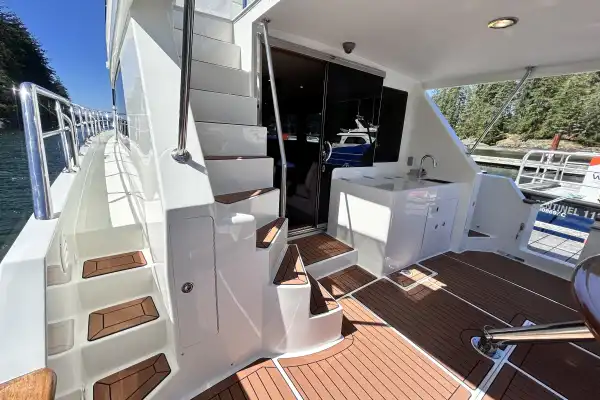 Entry to the boat is gained from the swim grid, through the transom, or through a portside gate into the cockpit. The cockpit is full width with a SeaDek sole, a long aft bench with an oval table. There is a wet bar to starboard of a sliding glass door into the saloon. Flanking the cockpit are molded stairs to the side decks that lead to the foredeck. To port of the sliding glass door is also a molded fiberglass curved staircase to the quarterdeck and flybridge. There is a helm in the cockpit with throttles and thruster control. With the extended cover over the full cockpit, it becomes a fantastic indoor/outdoor space for everyone to enjoy.